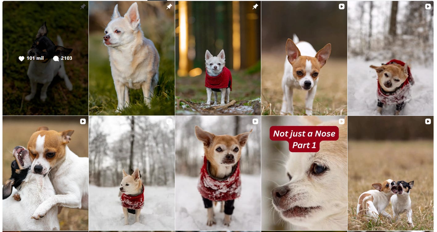 Percorri a conta e percebi que a dona da conta é uma fotógrafa que criou o espaço mais pela fotografia e os cães apoderaram-se daquilo.